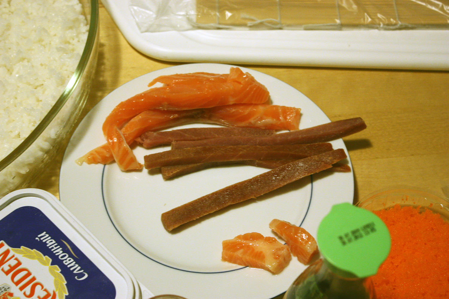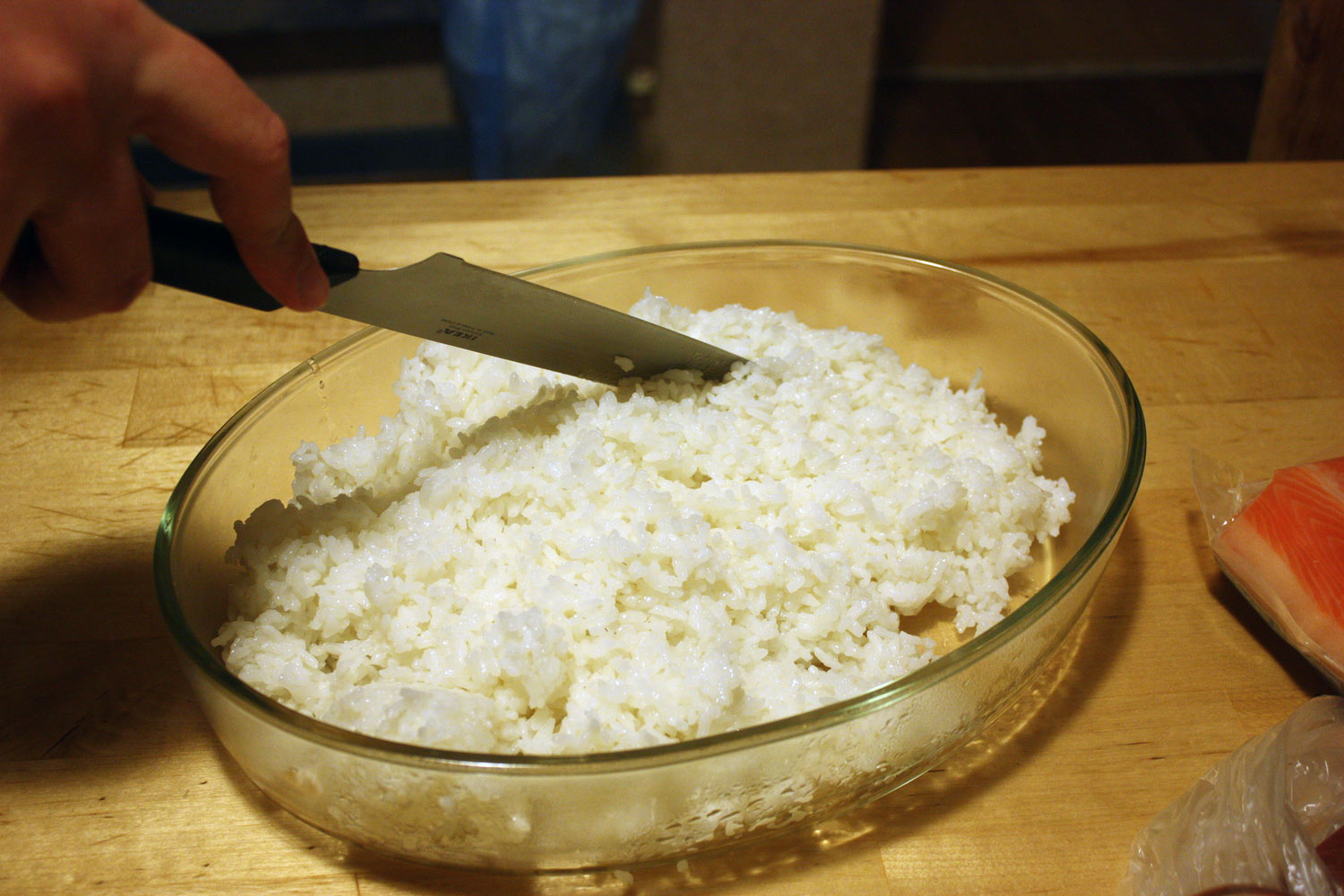 RC_Bu-Bu 65 Author Report Share Posted December 25, 2009 Приготовление роллов. Японский фастфуд. (На фотках все хитрости приготовления демонстрирует мой муж, более известный в наших кругах как RC_PolLitruk.) Часть 1. Роллы обыкновенные. Для приготовления нам понадобятся следующие продукты. 1. Рис. В принципе для роллов можно брать рис любой. В различных магазинах активно подсовывают специальный рис для суши, который стоит дороже любого другого, однако его вкусовые качества не пропорциональны цене. Поэтому если у вас денег много, то можно брать специальный рис, если не много или просто жалко дарить деньги спекулянтам, то лучше всего брать рис «Японика», который продается практически в любом магазине. Последнее время я в основном использую именно этот рис. 2. Водоросли нори. Большие листы морской капусты (показаны на фотке 1, это там где на этикетке нарисованы сашими с красной икрой). У них бывают разные этикетки, но размеры примерно все одинаковые. Продаются в больших универсамах, обычно я покупаю в Ашане. 3. Какая-нибудь рыбка. Если сурово следовать рецептам приготовления японского фастфуда, то в роллы надо класть либо сырую рыбу, либо копченую. Однако если ты не настоящий зеровод или не собираешься с роллами уговорить не менее 750 грамм водко-эквивалента , то я не советую использовать сырую рыбу, особенно ту, что предлагают в специализированный типа японских магазинах, т.к. в основном эту рыбу к нам везут из Вьетнама. Я обычно использую слабосолёную сёмгу, горбушу или любую другую слабосолёную красную рыбку собственного или казенного приготовления. Помимо слабосоленой красной рыбы, я использую копченый тунец, копченый угорь, масляную рыбу холодного копчения. 4. Авокадо и свежие огурцы. 5. Рисовый уксус. Самое простое купить уже готовый к употреблению рисовый уксус, на котором написано что-то типа специально для суши. Продается в больших супермаркетах. Если делать самим, то уксус доводить до 3% раствора, на 100 гр. такого раствора добавлять 3 столовые ложки сахара и 1 ст. ложку соли. Уксус брать желтый или красный рисовый. В крайнем случае, можно яблочный. 6. Соевый соус, васаби, маринованный имбирь. Как варить рис. Предварительно рис надо промыть. По идеи вымыть его надо до такого состояния, чтобы при заливе его водой и последующем размешивании не появлялось белой мути. Я правда никогда не довожу до такого идеального состояния, т.к. процесс мытья надоедает, но не менее минут 15. Для варки риса лучше всего использовать рисоварку, но у меня её нет, поэтому рис будем варить в кастрюльке с прозрачной крышкой. Прозрачная крышка нужна для того, чтобы видеть процесс варки и регулировать его. Рис и воду брать в соотношении 1:1,66 по весу (на пачках с рисом часто пишут 1:2, но для роллов это не самое удачное соотношение, не ведитесь на него). Ставим кастрюльку с водой на огонь, закрываем крышкой, доводим воду до появления маленьких пузырьков (т.е. кипение еще не началось), закидываем рис. Огонь делаем слабым. С этого момента до полного приготовления крышку открывать – нельзя! Смотрим на процесс варки через крышку, ждём когда вся вода впитается. Времени должно пройти не менее 10 минут, а лучше больше. Если вода исчезла за меньшее время, значит, вода в парообразном состоянии ушла в воздух, а не впиталась рисом. Когда вся вода впиталась – снимаем рис с огня, крышку не открываем и выдерживаем рис еще мин
